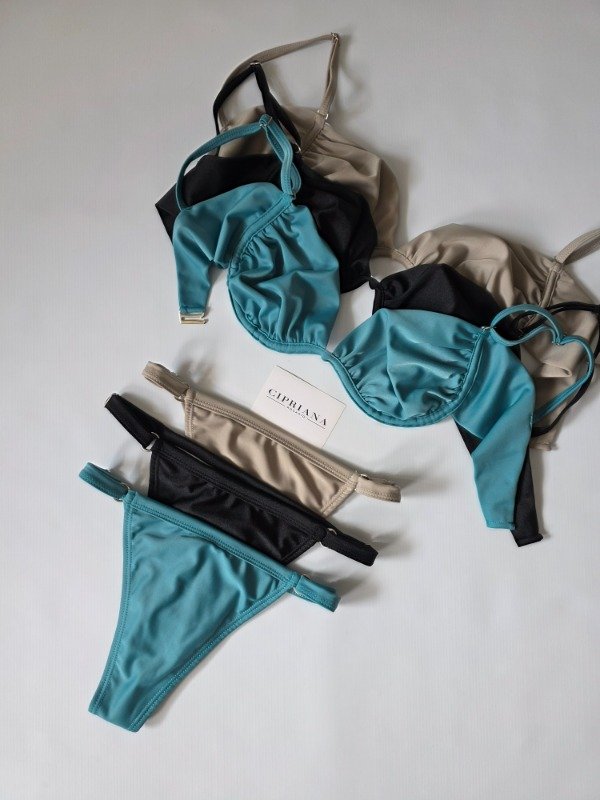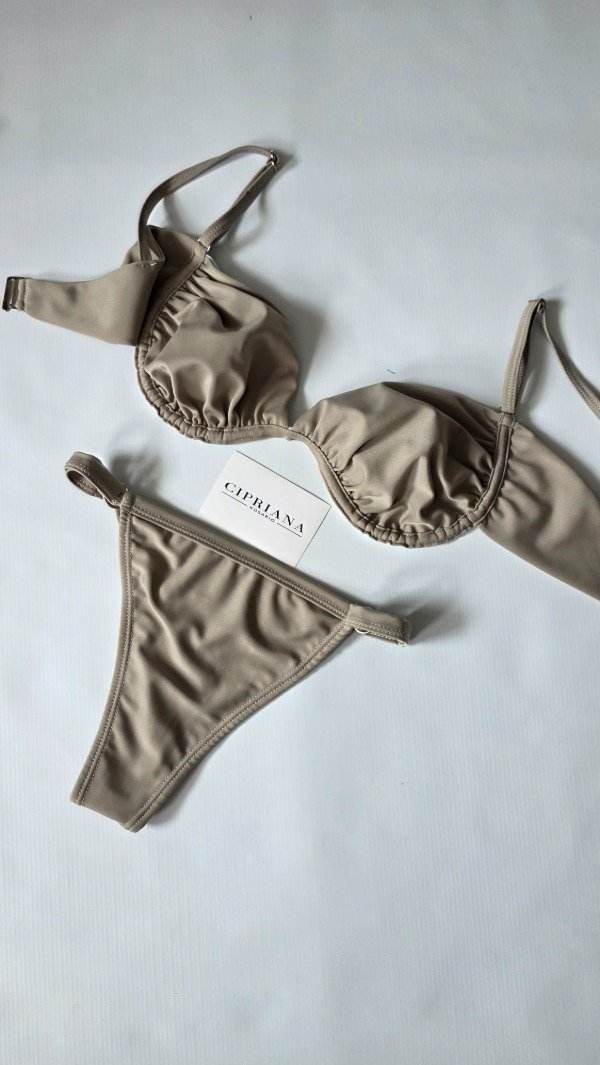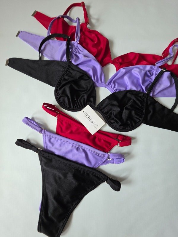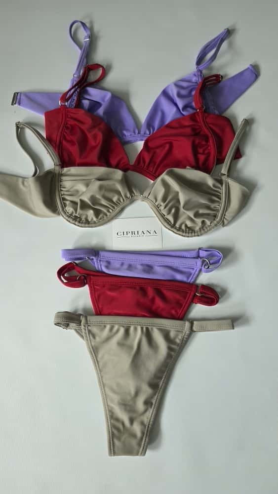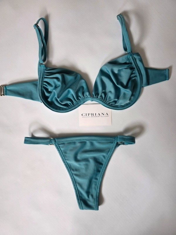Bikini con aro y frunces esta diseñado para brindar soporte y realce natural , breteles regulables.